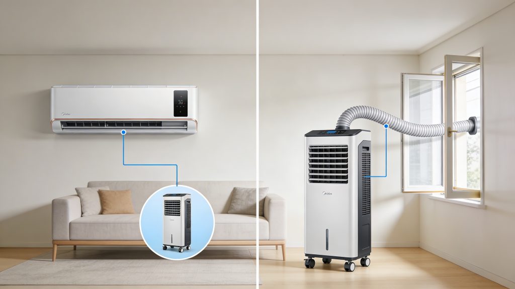 Si vous ne pouvez pas réaliser de travaux, le climatiseur mobile (ou climatiseur portatif) est une solution d’appoint. Bien que pratique car monté sur roulettes, il nécessite de passer une gaine d’évacuation par une fenêtre pour évacuer l’air chaud, ce qui peut nuire à l’étanchéité thermique de la pièce.